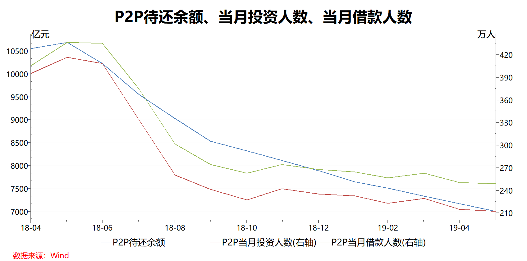 万得数据显示,2019年5月网贷平台的成交总额为930.03亿元,较上月微降7.71亿元,降幅不足1%(0.82%);从待还余额来看,2019年5月为7002.35亿元,环比下降2.42%;从当月投资人数来看,2019年5月为212.13万人,较4月投资人数下降1.33%,而4月份较3月的环比降幅为6.3%;在当月借款人的数上,2019年5月的数量是248.93万人,与上月相比,环比降幅仅为0.64%,同样不及1%,但基本恢复到了2017年3月时的水平。