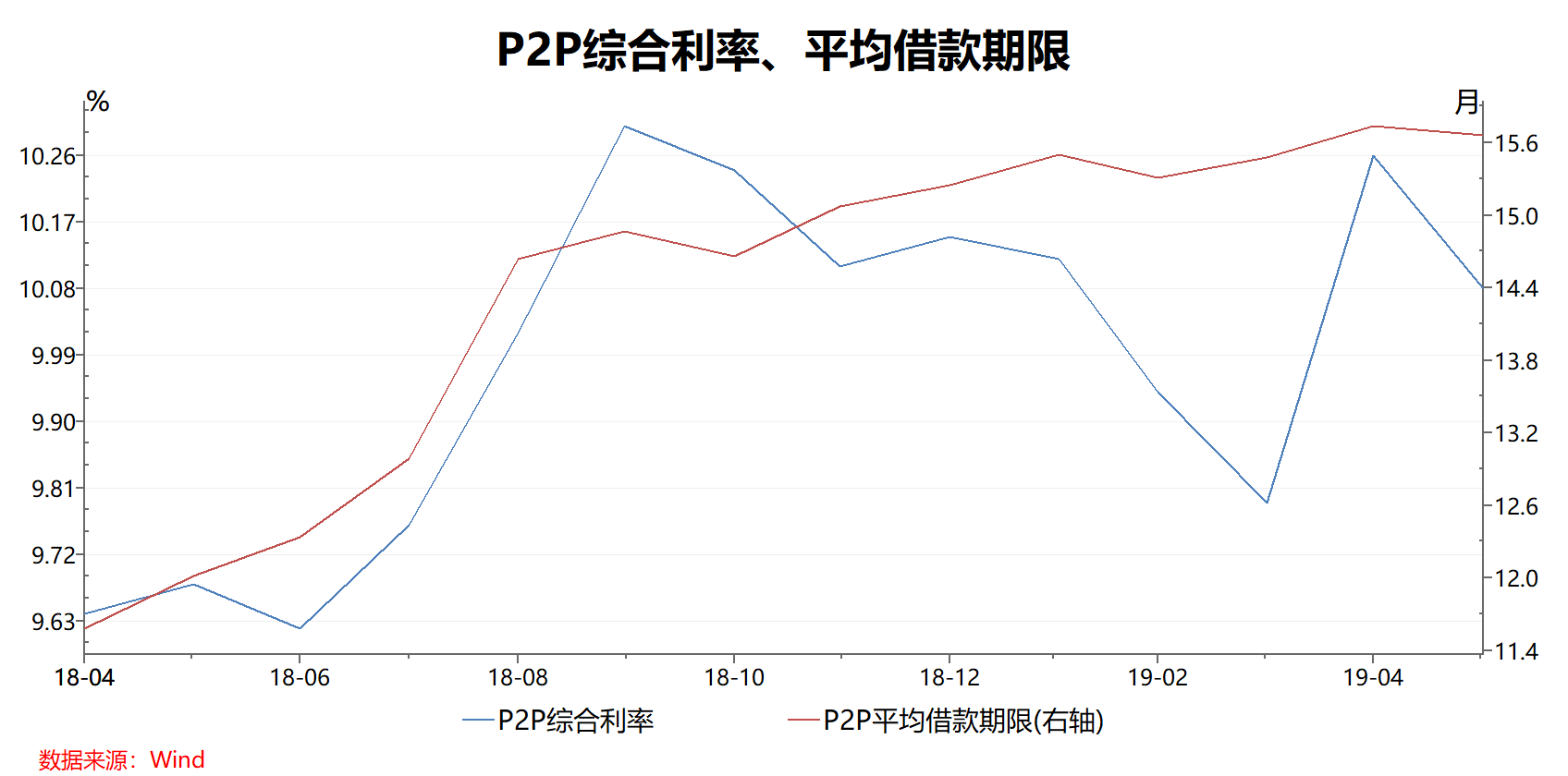 万得数据显示,2019年5月P2P行业在综合利率和借款期限上同时扭转了4月份的上升趋势。其中,网贷行业综合收益率为10.08%,环比下降18个基点;平均借款期限为15.66个月,环比缩短0.09个月。